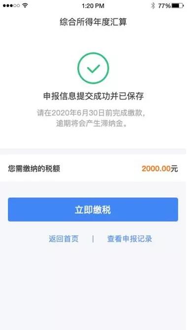 若您收入不足 12 万元且有应补税额,或者收入超出 12 万元但应补税额≤400 元,申报提交后无需缴款。