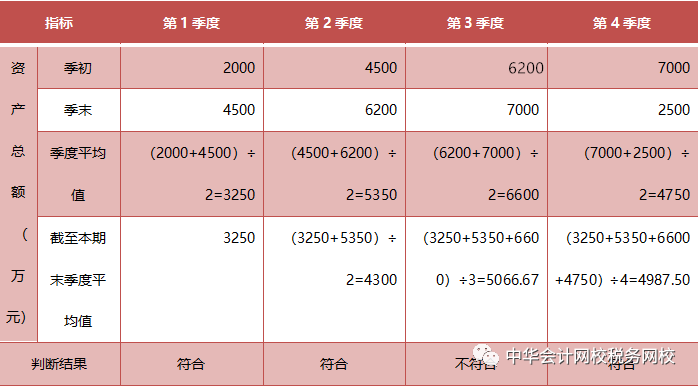 例:A公司2019年成立,从事国家非限制和禁止行业,假设从业人员和应纳税所得额均符合小型微利企业条件,2020年各季度的资产总额分别为: