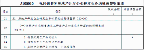 第25行“3.实际发生的税金及附加、土地增值税”:第1列“税收金额”填报房地产企业销售未完工产品实际发生的税金及附加、土地增值税,且在会计核算中未计入当期损益的金额;第2列“纳税调整金额”等于第1列“税收金额”。