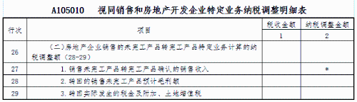 第29行“3.转回实际发生的税金及附加、土地增值税”:填报房地产企业销售的未完工产品结转完工产品后,会计核算确认为销售收入,同时将对应实际发生的税金及附加、土地增值税转入当期损益的金额;第2列“纳税调整金额”等于第1列“税收金额”。
