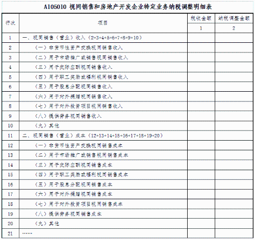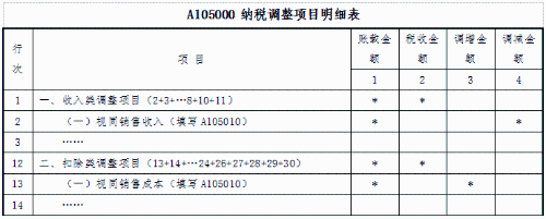 第1行“一、视同销售收入”:填报会计处理不确认销售收入,而税收规定确认为应税收入的金额,本行为第2行至第10行小计数。第1列“税收金额”填报税收确认的应税收入金额;第2列“纳税调整金额”等于第1列“税收金额”。