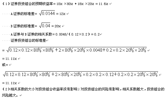 (2)当A证券与B证券的相关系数为0.5时,投资组合的标准差为12.11%,结合(1)的计算结果回答以下问题:①相关系数的大小对投资组织收益率有没有影响?②相关系数的大小对投资组合风险有什么样的影响?
