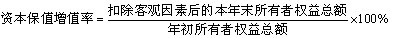 资本保值增值率,是企业扣除客观因素后的本年末所有者权益总额与年初所有者权益总额的比率,反映企业当年资本在企业自身努力下实际增减变动的情况。其计算公式为: