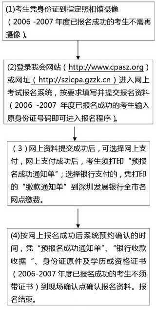 1、本年度注册会计师考试报名,深圳市注册会计师协会(下称我会)继续实行“网上预报名、现场确认”的办法。具体考试报名流程图如下: