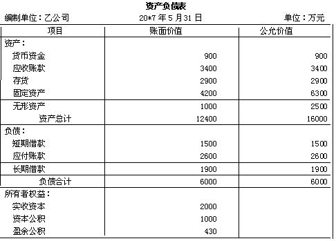 【说明】由于本题中给定了20×7年5月31日乙公司所有者权益公允价值合计10000万元,如果确认递延所得税将影响该公允价值,又有悖于该题条件,因此考生若假定对子公司个别报表进行调整时不考虑所得税的影响应该属于正确。即:长期股权投资的成本=500×16.6+6=8306万元;购买日应确认的商誉=8306-10000×80%=306万元。以下据此调整。