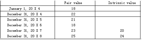 (a)The company granted 100 cash share appreciation rights (SARs) to each of its 300 senior management employees, conditional upon the employees remaining in the company‘s employ for the next three years. The cash share appreciation rights provided the employees with the right to receive, at the date the rights were exercised, cash equal to the appreciation in the company’s share price since the grant date. On December 31, 20 X 6, all SARs held by the remaining employees vested. They could be exercised during 20 X 7 and 20 X 8. The fair value and the intrinsic value (which equals the cash paid out) of SARs are shown below.