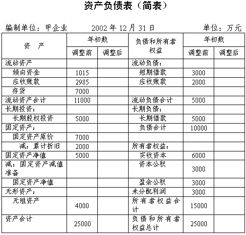 2、按核实批准后的资产价值,调整2003年甲企业资产负债表有关项目的年初数,并填入下表调整后栏内。(见表5)