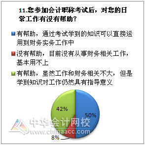很多初次参加会计职称考试的学员对考证很迷茫,不知道考证对自己是否有帮助或有多大的帮助。从图十一的数据可以看出,50%的学员可以把通过会计职称考试学到的知识运用到财务实务工作当中;高达42%的学员,虽然工作与财务相关不大,但通过会计职称考试学到的知识,也对工作有指导意义;只有8%的学员,由于没有从事财务相关工作,表示基本用不上通过会计职称考试所学的知识。可见,会计职称考试对我们的工作不仅有实际的帮助,如果拿到了职称证书,还可能会得到更高的薪酬和更大的职业发展空间。对于实务工作经验比较欠缺的学员,可以选择网校的实务操作网上辅导课程进行学习;在工作中遇到的实务操作问题,也可以到会计实务探讨论坛里和大家一起交流。