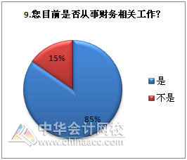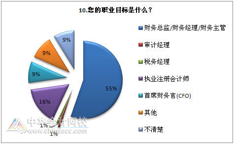 如图九所示,参加会计职称考试的学员中,有85%的学员从事财务相关工作,其中职业目标为财务总监/财务经理/财务主管的占55%,可见这个职位受众多学员青睐;职业目标为执业注册会计师的仅占16%,这也从一个侧面反映了注册会计师考试的难度较大,但也并非高不可攀;职业目标为首席财务官以及其他(其中大部分为会计)的各占9%;其余9%的学员还不清楚自己的职业目标,在此建议这部分学员,多和成功或有经验的前人交流,例如可以多参加网校举行的类似【会计三人行】04期:小企业和事务所的选择等交流活动,也可以多读类似《HP(惠普)大中华区总裁孙振耀退休感言》这样的文章来启发自己思考,以尽早确定自己的职业目标,然后为之努力。