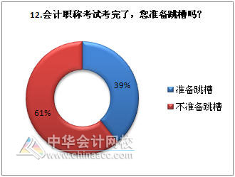 受到金融危机的影响,目前国内的就业现状非常严峻,对于跳槽人们也非常谨慎,从图十二也可以看出,约占61%的学员没有准备在会计职称考完后跳槽,也是为了先求生存再求发展。