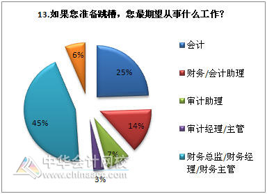 对于已经工作几年的会计人,在跳槽时也需要多分析自己的优势和劣势,明确自己的职业目标,走好每一步,不要盲目跳槽,以免影响自己的职业发展。据图十三所示,对于财务总监/财务经理/财务主管这样的高层职位,是很多会计人向往的,也是目前众多企业急需的人才,那么我们应该做的是,分析人才市场的需求,然后结合自身的条件,找到自己缺乏的东西,比如专业知识、沟通能力等,再通过从事相应的职位去完善自己,从而实现自己的职业目标。