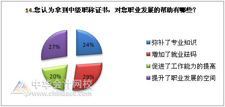 对于会计人的职业发展来说,中级职称证书主要起到敲门砖的作用,如图十四所示,它增加了我们就业的砝码,弥补了专业知识的不足,但是工作能力还需要靠我们在实际工作当中去运用这些所学的知识才能逐步提高,等到我们能力具备,又拥有相应证书的时候,那么谋求更好的职业发展就指日可待了!