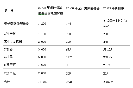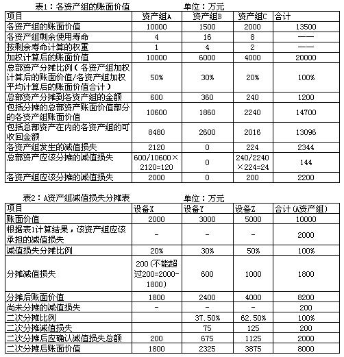 (2)A 资产组为一生产线,该生产线由X、Y、Z三部机器组成。该三部机器的成本分别为4000万元、6000万元、10000万元,预计使用年限均为8年。至20*8年末,X、Y、Z机器的账面价值分别为2000万元、3000万元、5000万元,预计剩余使用年限均为4年。由于产品技术落后于其他同类产品,产品销量大幅下降,20*8年度比上年下降了45%.
