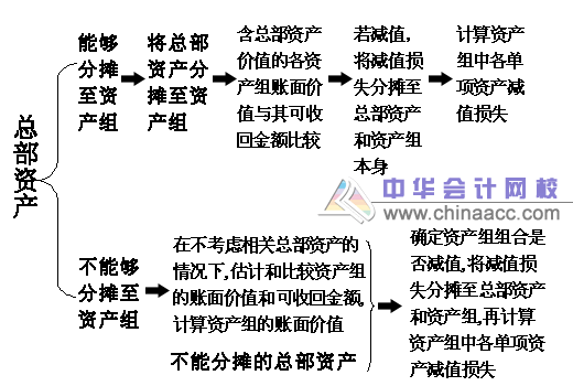 第一种是总部资产可能有一部分能够按照合理和一致的基础分摊至资产组,此时要将包含这部分总部资产的资产组的账面价值和其可收回金额比较,然后按照上面资产组减值测试的顺序和方法处理;