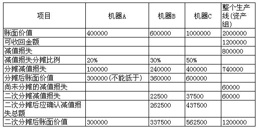 注:按照分摊比例,机器A应当分摊减值损失16万元(80万元×20%),但由于机器A的公允价值减去处置费用后的净额为30万元,因此机器A最多只能确认减值损失10万元(40万元—30万元),未能分摊的减值损失6万元(16万元—10万元),应当在机器B和机器C之间进行再分摊。