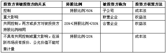 初始投资成本金额确定以后,不考虑其他实质上对被投资企业形成控制的因素,通过下表来判断采用成本法还是权益法核算: