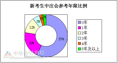 从以上饼状图可以看出,在新考生中,57%左右的考生是第一次参加注册会计师考试,因此,新考生没有必要过分担忧自己的基础问题,大部分考生都是新手,都在同一个起跑线上,只要树立必胜信念,通过网校这个优质的学习平台,踏实、认真地学习和准备,就不会输给其他人;而在已经参加过注册会计师考试的新考生中,参考过1~2年的占32%左右,这部分考生应该有了一定的经验,对于考过的科目,内容基本上已经熟悉,在2009年里要好好利用这个优势,特别是考过会计、审计和财管的考生,由于新制度下第一年难度会有所下降,更应该争取在2009年里通过;剩余的约11%的新考生参加考试年数都在3年以上,这部分考生要树立自信心,首先要分析考了3年多还没有通过的原因,改善自己的学习方法,其次要充分利用自己熟悉考试内容的优势,争取在过渡年里满载而归。