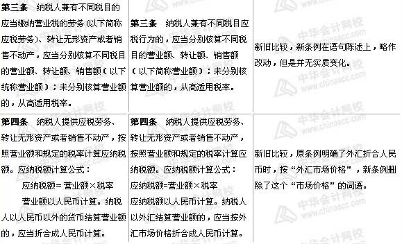 第九条 纳税人兼营免税、减税项目的,应当分别核算免税、减税项目的营业额;未分别核算营业额的,不得免税、减税。 | 第七条 纳税人兼营免税、减税项目的,应当单独核算免税、减税项目的营业额;未单独核算营业额的,不得免税、减税。 | 新旧条例比较,新条例将原来的“单独核算”改为“分别核算”。并无实质变化。 |