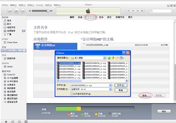 第一步:将iPhone/iPad连接到电脑后,启动iTunes,进入“应用程序”界面,将已下载到电脑中的课程“添加”到“正保会计网校”应用中。
