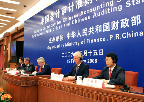 2月15日,继中国会计审计准则体系发布会之后,财政部在北京召开了会计审计准则国际趋同演讲会。国际会计准则委员会主席戴维·泰迪先生(DAVID TWEEDIE)、国际会计师联合会秘书长伊恩·保罗先生(IAN BALL)和国际审计与鉴证准则理事会主席约翰·卡洛斯先生(JOHN KELLAS)等国际会计审计专家,就会计审计准则国际趋同问题,先后在会上作了精彩演讲(全文另发)。演讲中,他们介绍了国际会计审计准则的发展和未来几年的工作规划,高度评价了中国会计审计准则国际趋同工作所取得的成绩,他们指出,中国会计审计准则体系的发布实施,使中国会计审计准则与国际准则之间实现了趋同,是促进中国经济发展和提升中国在国际资本市场中地位的非常重要的一步。
