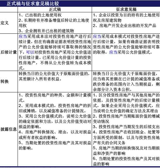 我们注意到本次正式颁布的《企业会计准则第3号—投资性房地产》与去年7月发行的《投资性房地产—征求意见稿》相比,对公允价值的使用略为谨慎。而成本法依然是投资性房地产后续计量的主导方法。另外在投资性房地产价值变动对损益及所者权益所带来的影响的信息披露方面,正式稿也更加充分。