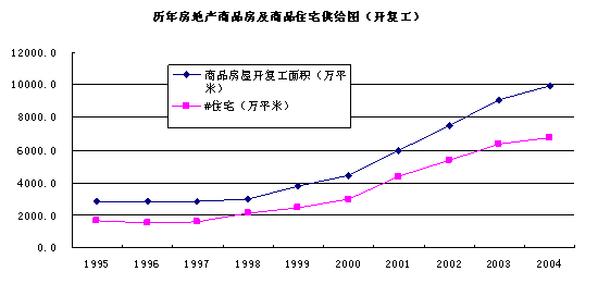 在上图中我们看到,商品房及住宅的供应是逐渐增加的,但在总体房地产投资中所占比例却是减少的,2004年后,这种减少已经体现在总量上和比例上的双重减少。根据北京中原地产总经理李文杰提供的北京市房地产信息网的数据,2004年北京市商品房全部新增供应上市套数29万套左右,而2005年的新增供应上市套数在22万套左右。与持续增加的房地产刚性需求相比,供需产生了很大的矛盾。