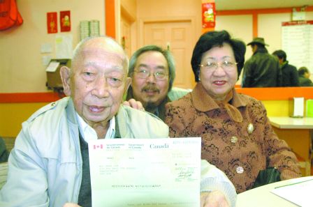 加拿大联邦农业部长斯特拉(Chuck Strahl)在中侨互助会华埠会址颁发了这2张支票,受惠人是2名在世的“人头税”付税人周祖耀与及林关友。