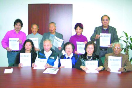 平权会及安省“人头税”苦主及家属联盟﹑安省中华总会馆及“人头税”后人﹐均希望加国政府对“人头税”子女作出全面平反。前排左起为华文娟﹑刘来增﹐后排左1为黄煜文。(加拿大《明报》图 利棣儿摄)