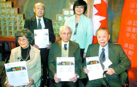 加拿大联邦多元文化部长小田(后右)向各苦主颁发赔偿支票后与各苦主合照留念,他们分别为谭炳寅(后左)、李彩球(前左)、谭旭宏(前中)及林培芳(前右)