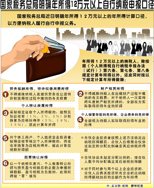 据国家税务总局网站消息,近日,国家税务总局发文明确了年所得12万元以上自行纳税申报口径问题,对有关应税所得项目的自行申报口径作了进一步明确规定。最近记者就一些读者提出对有关规定不够了解、甚至误认为国家将对股票转让所得恢复征收个人所得税问题走访了国家税务总局。国家税务总局有关负责人就此回答了记者提问。