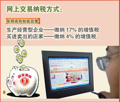 税务部门有关人士认为,网上交易的纳税方式适用于现行税收政策,即生产经营型企业在网上交易应缴纳17%的增值税;如果只是买进卖出的店家,也要缴纳4%的增值税。