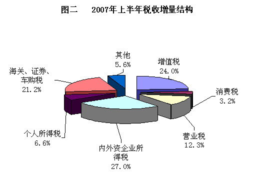 从税收结构看(如图一),国内增值税、内外资企业所得税、营业税和海关代征进口税收依然是税收收入的主要构成部分。2007年上半年,国内增值税、内外资企业所得税、营业税和海关代征进口税收收入占全国税收收入总额的比重分别为31.2%、22.8%、12.9%和11.8%。从收入增量看(如图二),全国税收收入的增长主要来源于内外资企业所得税、国内增值税、营业税和证券交易印花税、海关代征进口税收和个人所得税。2007年上半年,内外资企业所得税、国内增值税、营业税、证券交易印花税、海关代征进口税和个人所得税与上年同期相比分别增收1517亿元、1345亿元、692亿元、552亿元、542亿元和373亿元,占全国税收收入增收额的比重分别为27%、24%、12.3%、9.8%、9.7%和6.6%。