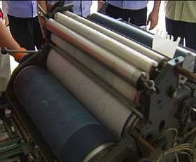这就是杨阿会用来印刷假发票的胶印机,机器的滚筒上,发票模板的印记清晰可见,已经印好的发票粘在上面。