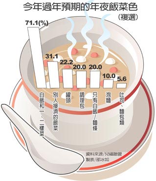 有媒体报道,台湾儿福联盟去年底针对近千名经济弱势家庭儿童及青少年的调查结果,有30%得靠接济才有年夜饭吃,20%以泡面和罐头吃年夜饭。
