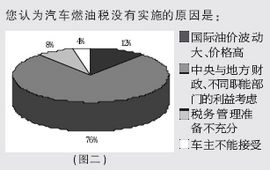 尽管日前国税总局相关人士表示,由于牵涉多方利益,方案设计复杂,年内燃油税能否出台还很难确定。但认为燃油税会在今年开始实施的读者仍占被访者的大部分。至于燃油税一再推迟实施的原因,大家普遍认为是由于中央与地方财政、不同职能部门的利益使然。说明燃油税能否真正实施,老百姓认为主要在于国家和政府的决心,以及相关职能部门能否理顺利益分配,调整机构设置(见图二)。