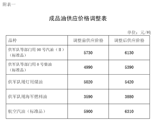 一、成品油生产经营企业供军队及新疆生产建设兵团、国家储备用汽、柴油(标准品,下同)供应价格每吨均提高400元,调整后的汽、柴油供应价格分别为每吨6130元和5390元。其他成品油价格相应调整。调整后的成品油标准品价格见附表一。非标准品价格由成品油生产经营企业按照国家规定的品质比率确定。
