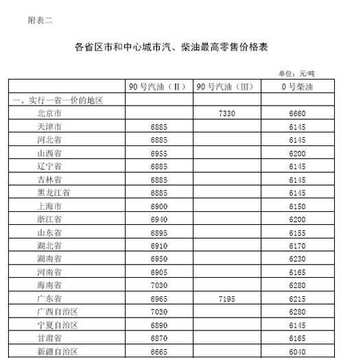 三、各地汽、柴油最高零售价格等额提高。调整后各省(区、市)和中心城市汽、柴油最高零售价格水平见附表二。各省(区、市)价格主管部门按规定的品质比率调整汽、柴油非标准品最高零售价格。