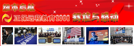 2008年,改革开放三十而立,北京奥运圆百年梦想。2000年至2008年,正保远程教育(CDEL)在董事长兼CEO朱正东先生的带领下快马扬鞭,战绩辉煌。2008年7月30日,正保远程教育成功登陆美国纽约证劵交易所,让中国和世界感受到正保的成熟和力量。在刚刚揭晓的福布斯2009中国最具潜力中小企业榜中,正保远程教育位居榜单前列。