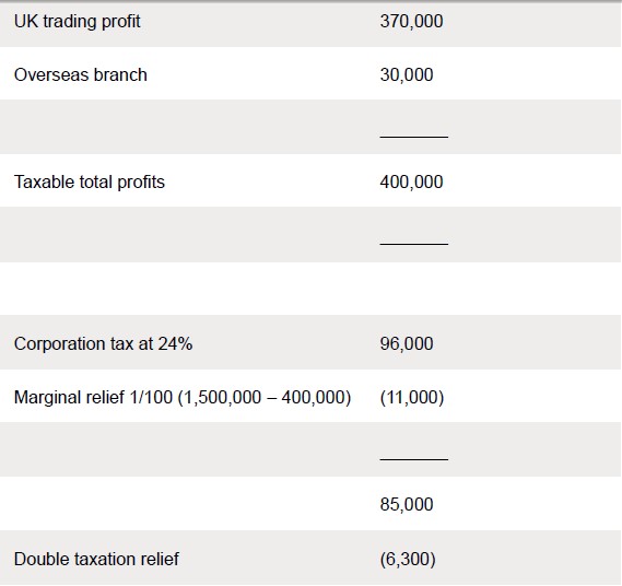 Gong Ltd is a UK resident company with an overseas branch. For the year ended 31 March 2013 the company made a trading profit of £370,000, and the branch made a trading profit of £30,000. Overseas corporation tax of £6,300 was paid in respect of the overseas branch’s trading profit.