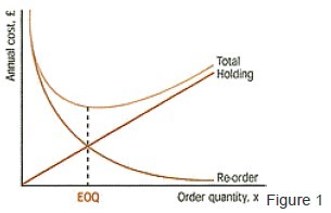 The total of annual holding and re-order costs first decreases, then increases. The point at which cost is minimised is the EOQ. This cost behaviour is illustrated by the graph in Figure 1.