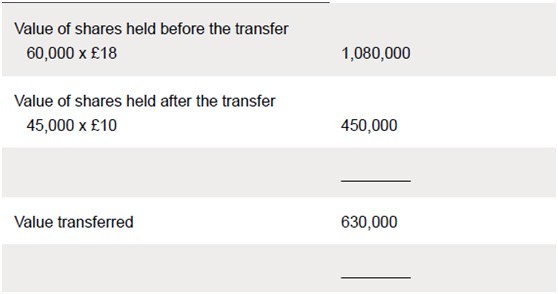 On 4 May 2012 Daniel made a gift to his son of 15,000 £1 ordinary shares in ABC Ltd, an unquoted investment company. Before the transfer Daniel owned 60,000 shares out of ABC Ltd’s issued share capital of 100,000 £1 ordinary shares. ABC Ltd’s shares are worth £8 each for a holding of 15%, £10 each for a holding of 45%, and £18 each for a holding of 60%.