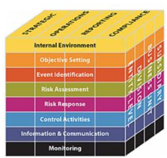 COSO’s guidance illustrated the ERM model in the form of a cube. COSO intended the cube to illustrate the links between objectives that are shown on the top and the eight components shown on the front, which represent what is needed to achieve the objectives. The third dimension represents the organisation’s units, which portrays the model’s ability to focus on parts of the organisation as well as the whole.
