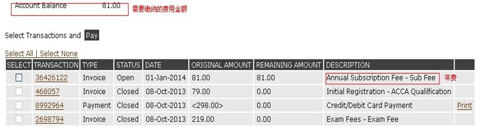 3、在’Annual Subscription Fee-Sub Fee’前的方框内打钩,并点击账单上方的’Pay’按钮。