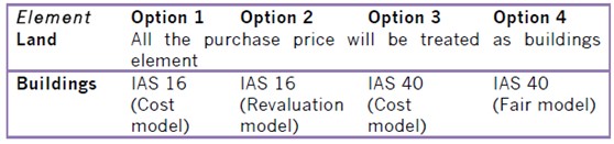 The buildings element should be recognised under IAS 16 (option 1 and 2) if it is owner occupied or under IAS 40 (option 3 and 4) if it is used for rental earned.