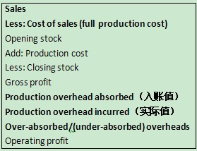7. Over/under absorbed: 如果入账(Overhead absorbed)的值小于实际值(Overhead incurred/ actual overhead),称为under absorbed,反之是over absorbed.
