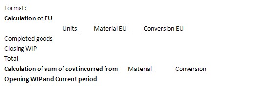 (1)Weighted average method: 这种方法下假设循环往复的过程,期初在产品在本期一定会转化为产成品,本期新投入的原料一部分会变成完工品,另一部分变成在产品。期末的完工品中包括期初的在产品以及本期投入。这种方法下,不考虑完工品的来源,而是看完工数量。