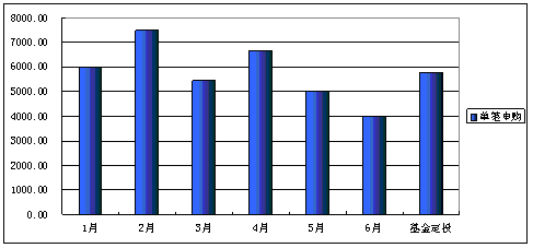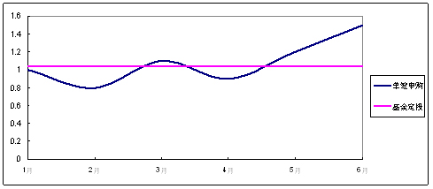 我们再来比较一下单笔申购和基金定投的份额和单位成本。若一个投资者有6000元钱,他选择一次性投资基金,则不同时点他申购的份额和单位成本将随基金净值而波动(表2),而选择基金定投方式每月支出1000元,连续投资6个月,共可获得5770.2份基金,单位成本为1.04元(表3),这样就可以有效降低风险,平滑投资成本(图2、图3)。