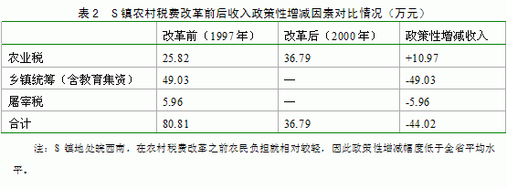 农村税费改革以后(2000年),安徽省农业两税及附加是37.61亿元,比改革前49.25亿元(包括改革前的农业税、特产税、乡统筹和村提留中的公益金、管理费)减少11.64亿元,再加上被取消的屠宰税和农村教育集资5.26,全省乡村两级政策内减少财力就达16.90亿元。其中,乡镇财政减收13.96亿元,平均每个乡镇减少收入75.46万元(可参考表2)。