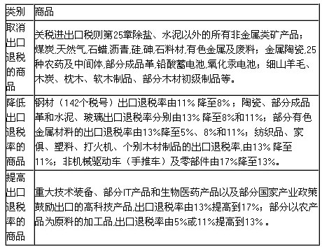 这次调整部分商品出口退税率,取消了部分资源性产品的出口退税,调低了部分高能耗、高污染产品的出口退税率,调高了国家产业政策鼓励出口的高科技产品如重大技术装备、部分IT产品和部分以农产品为原料的加工品的出口退税率。(见附表)