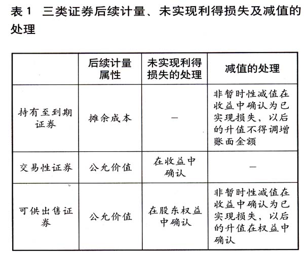 1993年,FASB发布了完全取代FAS12的FAS115“特定债务和权益证券投资的会计”,取消了按流动性划分投资的方法,将所有债券投资和可确定公允价值的权益证券投资按企业持有意图分为持有至到期证券、交易性证券和可供出售证券3类;取消了成本与市价孰低法,引入了公允价值计量;并对不同类证券的后续计量、未实现持有利得和损失及减值采取不同的处理方式。另外,对改变证券分类时未实现持有利得和损失也规定了不同的处理方式。三类证券在会计处理上的主要差异如下表1、表2所示: